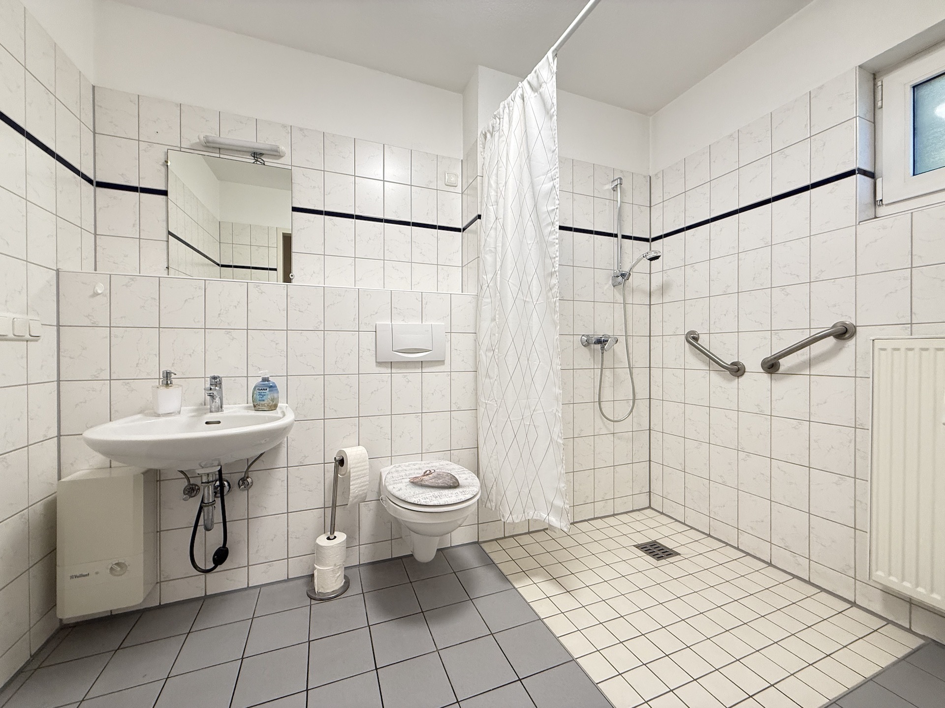 Neben dem Wohn- Essbereich verfügt die Wohnung über ein Schlafzimmer (ebenfalls nach Süden ausgerichtet), ein großes Duschbad sowie einen Abstellraum mit Anschlussmöglichkeit für Ihre Waschmaschine.