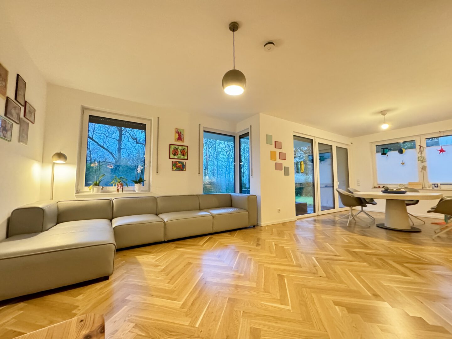 Die angebotene Fünf-Zimmer-Wohnung bietet auch für die große Familie eine ausgezeichnete Lebensqualität. Im Erdgeschoß gelegen genießen Sie zudem eine Große Terrasse mit einem eigenen Garten und den Blick ins Grüne. So begeistert Sie im Sommer die Terrasse und die Kinder die Möglichkeit im eigenen Garten zu spielen.