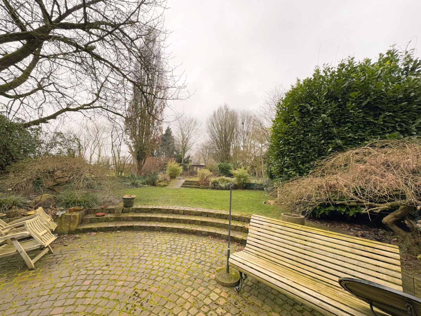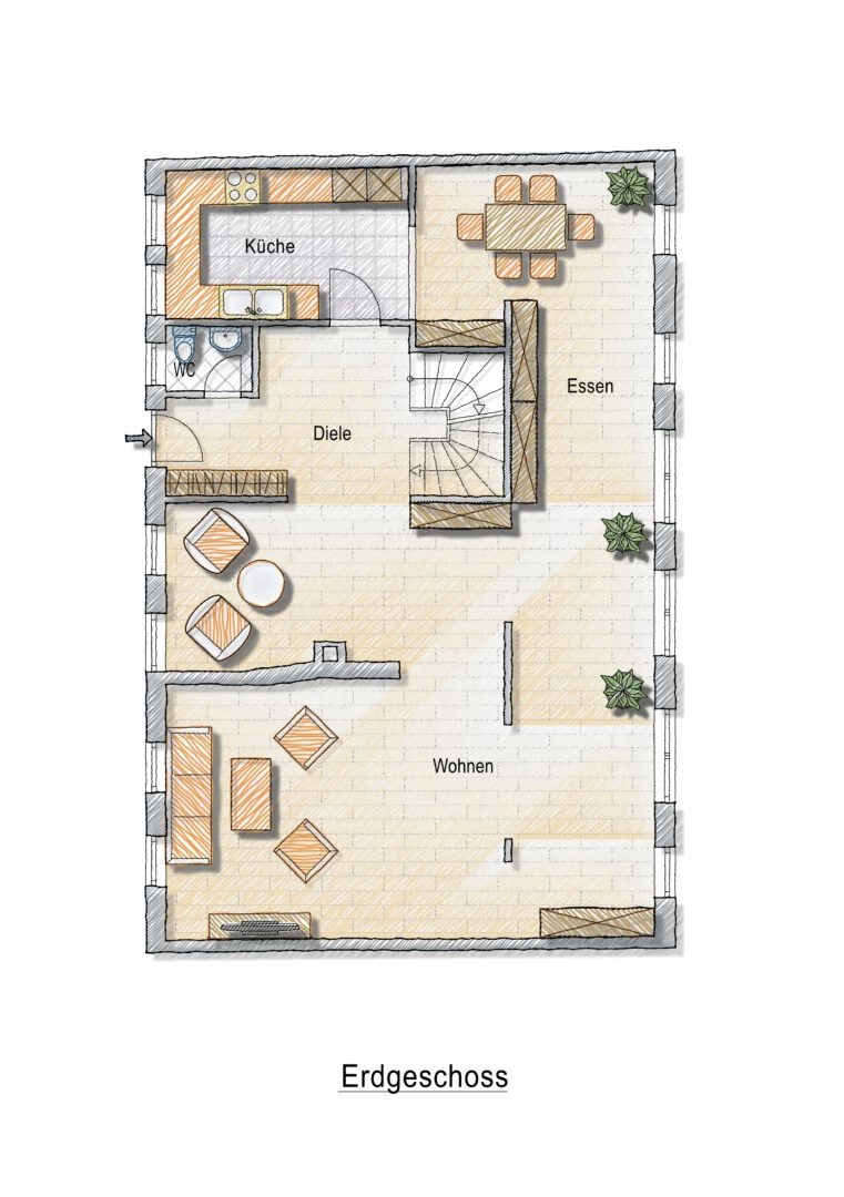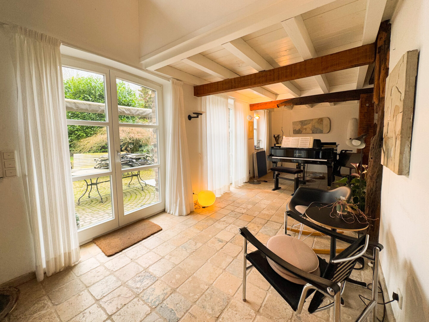 Das Erdgeschoss: Ein weitläufiger, offener Wohnbereich bietet vielseitige Gestaltungsmöglichkeiten – ob als stilvoller Essbereich, gemütliche Wohnlandschaft oder inspirierender Rückzugsort für Musik- und Medienliebhaber. Drei große doppelflügelige Türen schaffen fließende Übergänge zum nach Südwesten ausgerichteten Garten, der mit seiner großzügigen Fläche und hochwertigen Gestaltung eine perfekte Oase der Entspannung bildet.