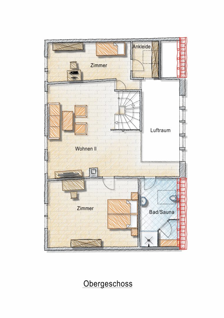 Das Obergeschoss: Zwei separate Zimmer sowie ein offener Wohnbereich mit Galerie schaffen ein einladendes Ambiente und bieten einen herrlichen Blick auf den Wohnraum und den Garten. Ergänzt wird diese Wohnebene durch ein schönes und helles Duschbad mit integrierter Sauna – ein perfekter Ort für entspannende Wohlfühlmomente.