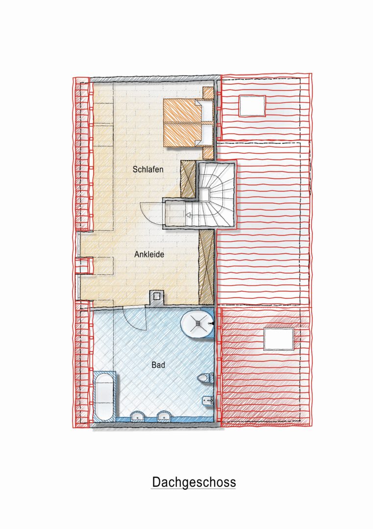 Das Dachgeschoss: Das weitläufige Hauptschlafzimmer besticht durch seine offene Architektur bis in die Dachspitze und verleiht dem Raum eine beeindruckende Atmosphäre mit einzigartigem Wohnflair. Ein angrenzender begehbarer Kleiderschrank sorgt für stilvolle Ordnung, während das exklusive Badezimmer mit Badewanne, Dusche, Doppelwaschtisch, WC und Bidet höchsten Komfort bietet – ein Rückzugsort, der Eleganz und Wohlgefühl perfekt vereint.