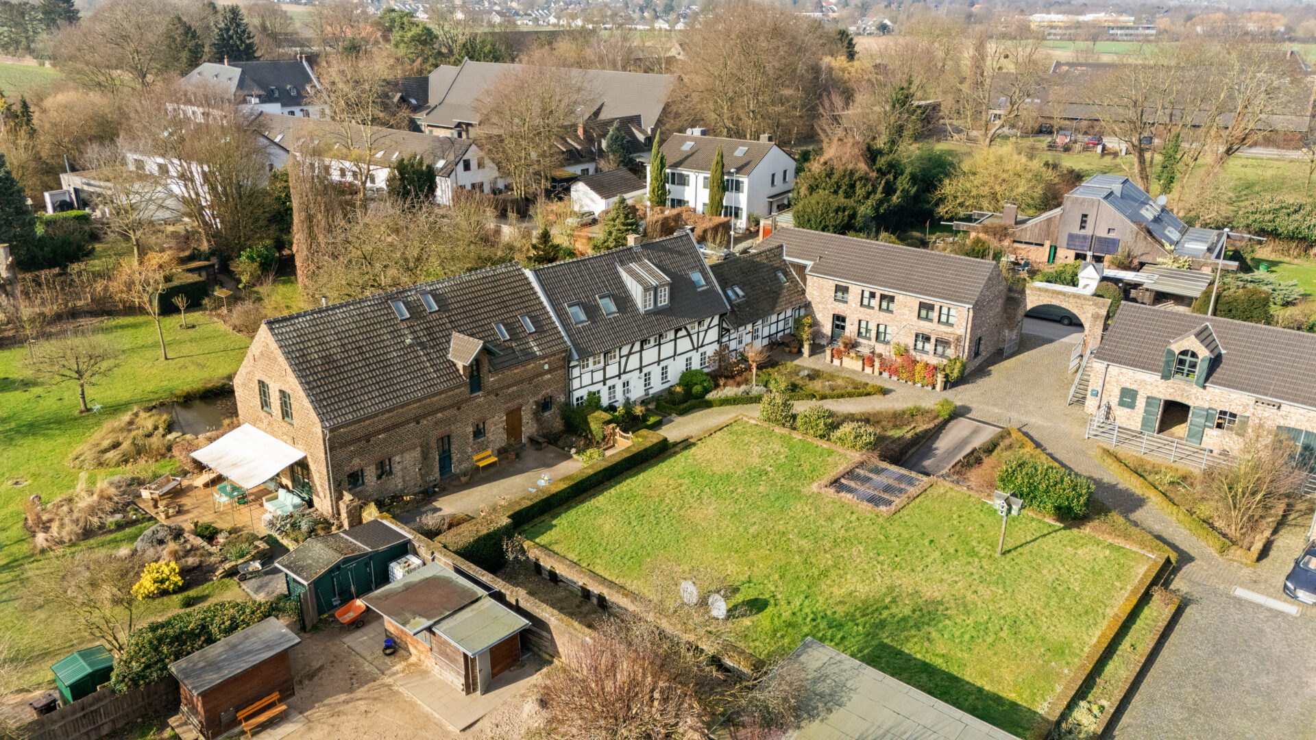 Der Vierkanthof wurde zudem durch eine Tiefgarage ergänzt, um den Hof autofrei zu halten und so die besondere Atmosphäre dieses Anwesens zu bewahren.