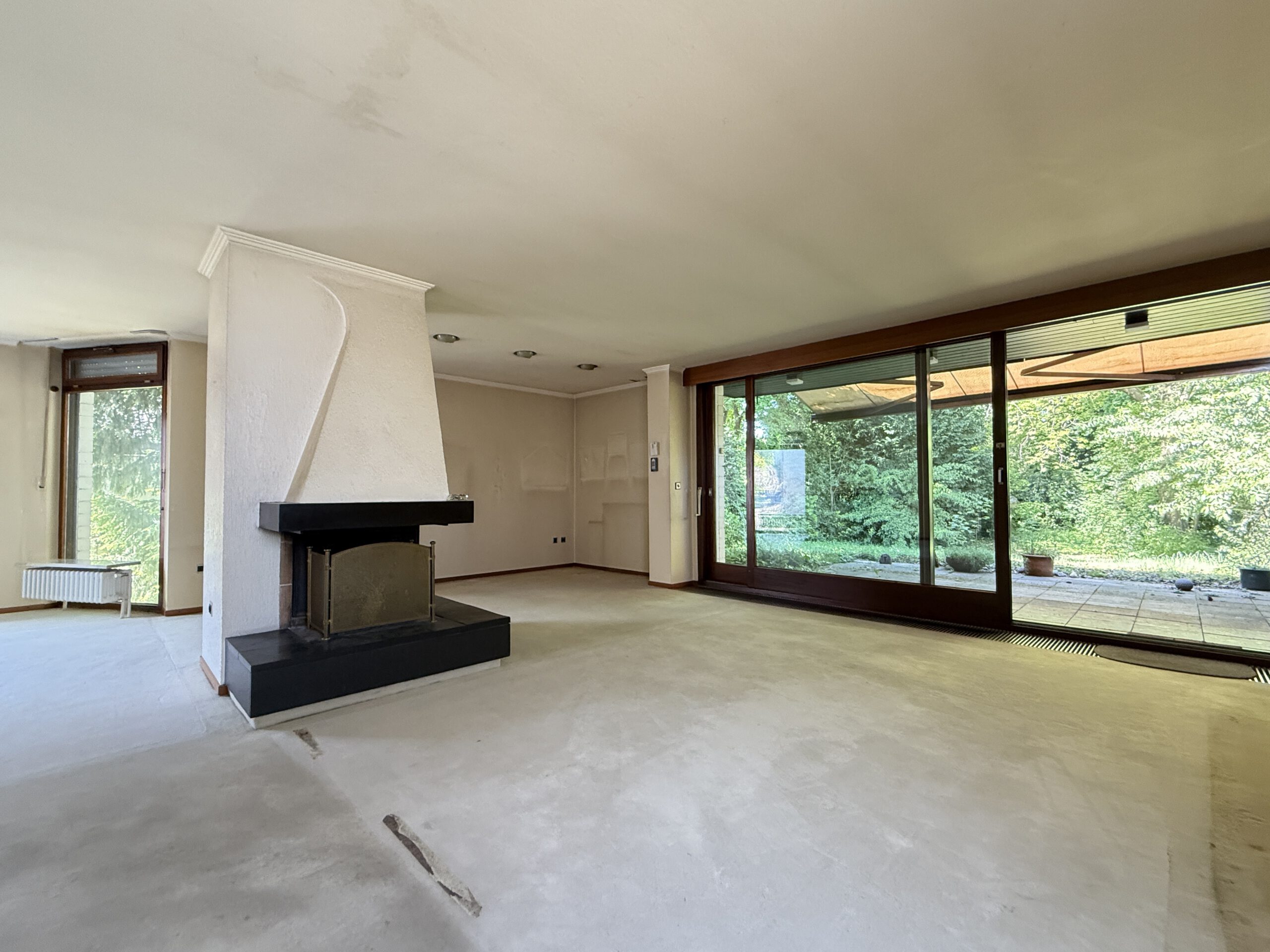 - Großzügiger offener Wohnbereich mit freistehendem Kamin und raumhoher Fensterfront zum Garten