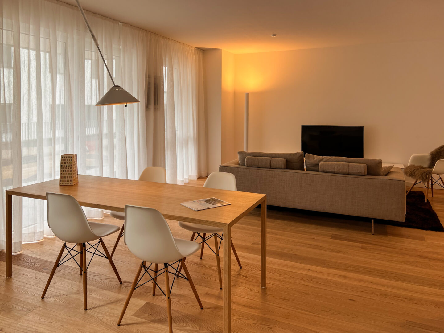 Der Wohn- Küchen- Essbereich ist durch die große Fensterfläche hell und freundlich. Die Aufteilungen sind so gestaltet, dass es möglich ist den Wohn- und Schlafbereich perfekt zu trennen.